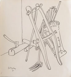 Lors de la taille, Charles portait des "socques", dont les épaisses semelles de bois isolaient ses pieds du terrain glacé. Il utilisait un sécateur forgé, trempé et affuté par son cousin François Bron, époux de feue Marguerite, dite "la tante Margot". L’un de ces sécateurs, réalisé artisanalement il y a plus de soixante ans, est toujours en notre possession, mais ce n'est pas lui qu'on voit représenté ici.